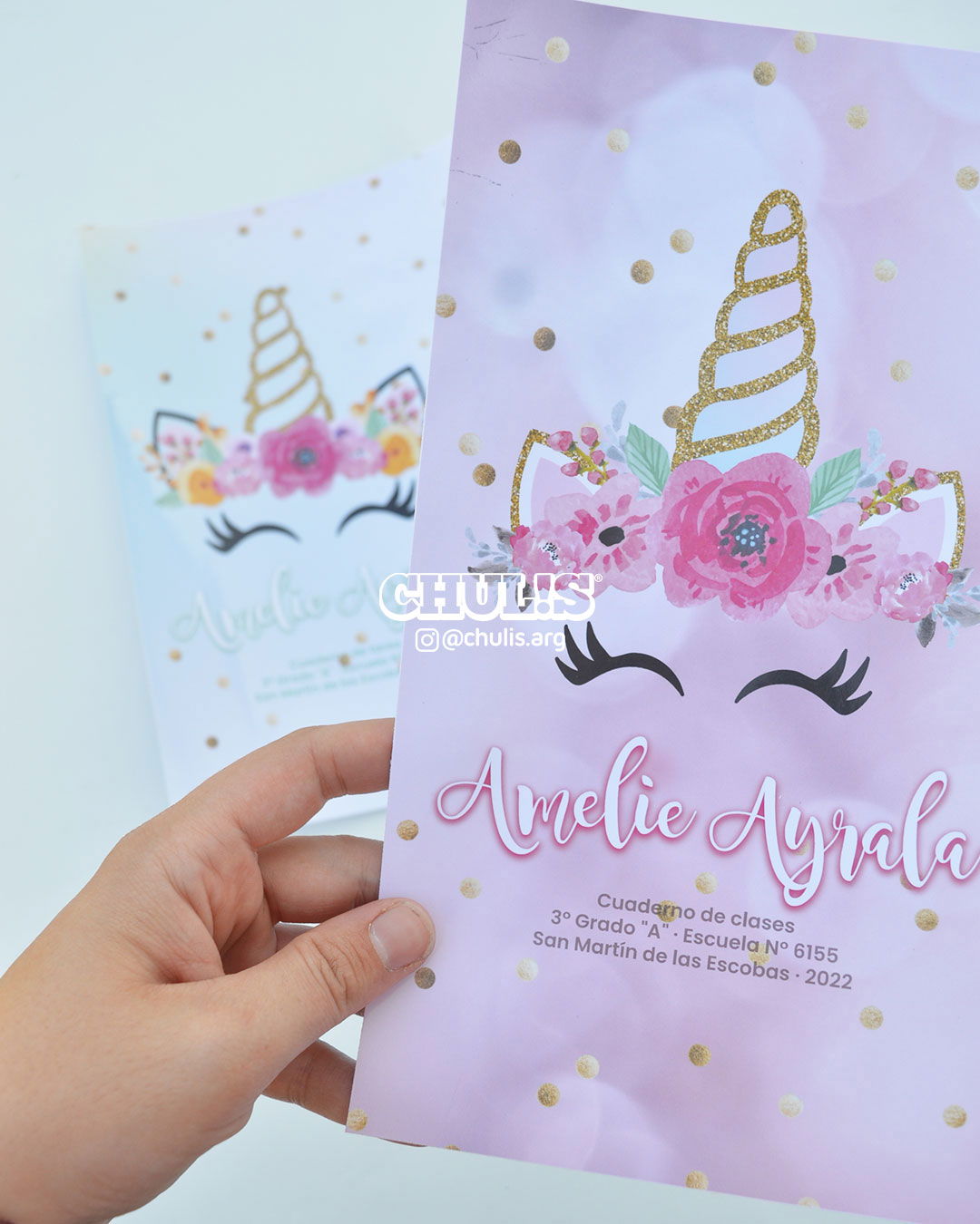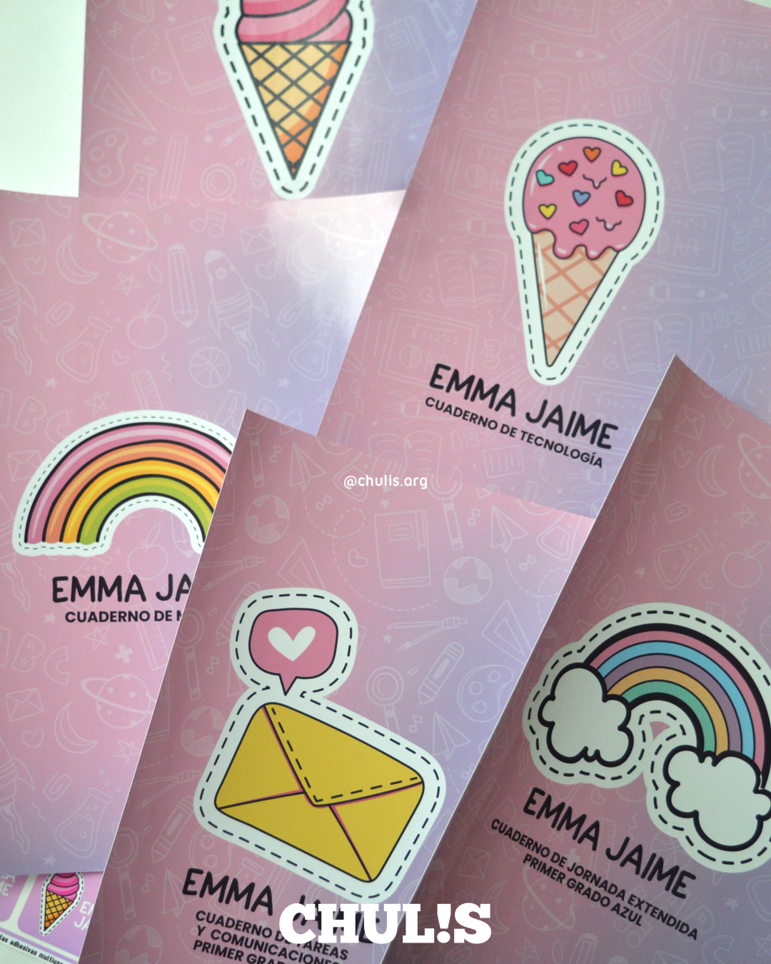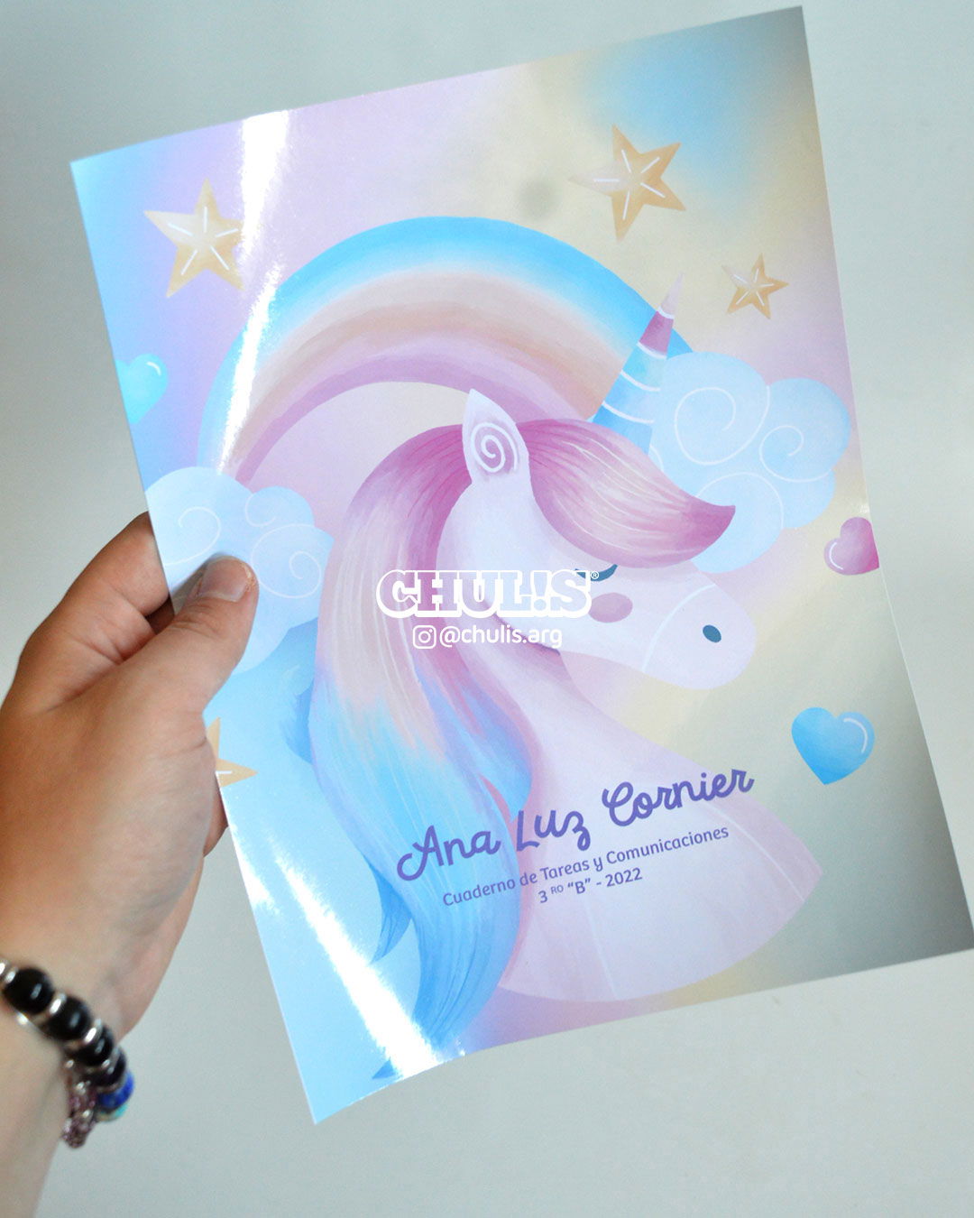 Debés brindarnos la información: nombre y apellido, materia del cuaderno, año de cursado, etc; y cómo te gustaría tu diseño (referencias como colores, personajes, etc, para poder armar tu diseño)