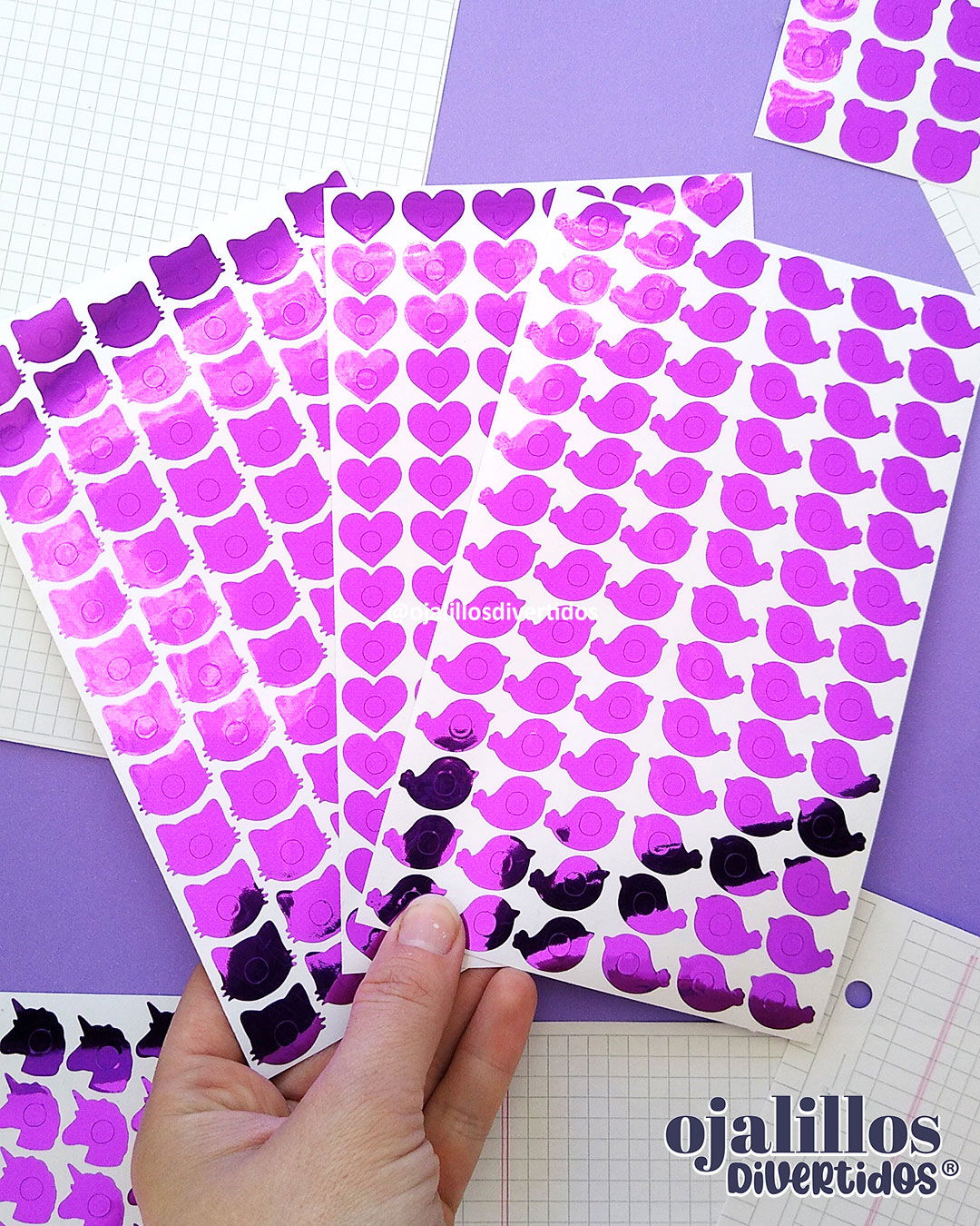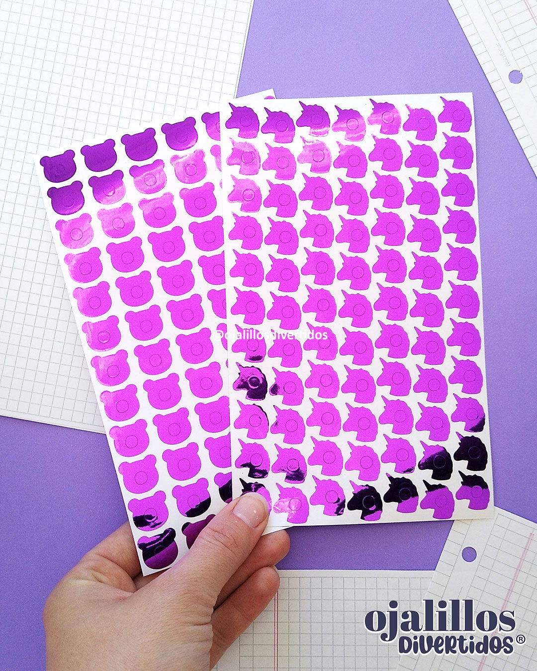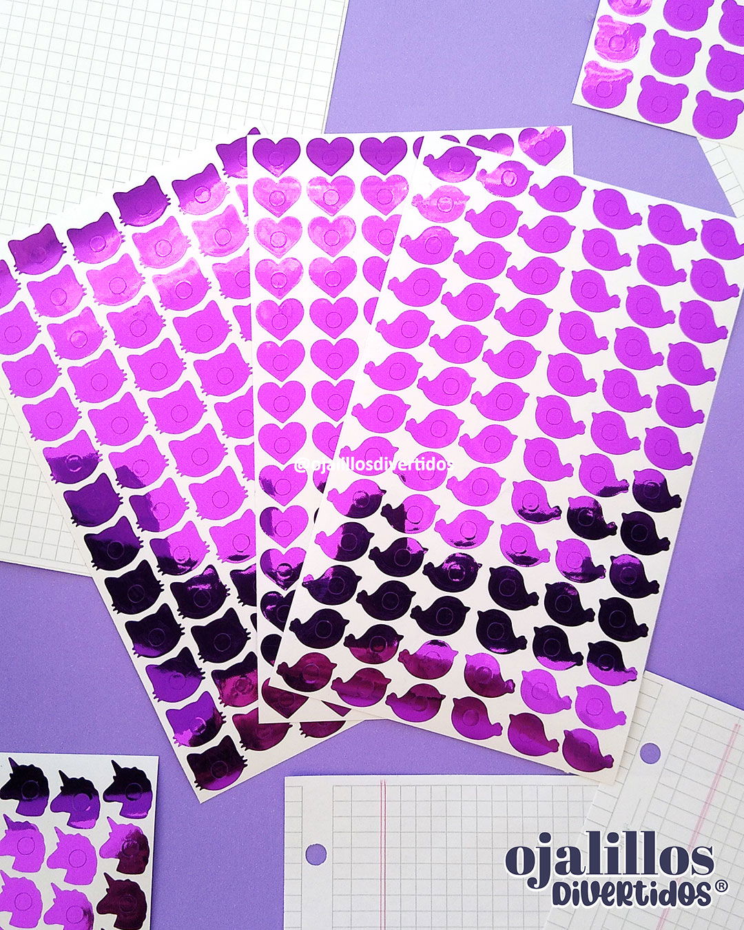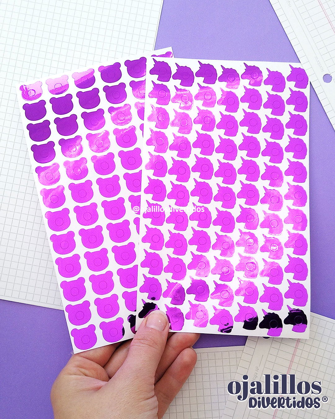 ¿Cuántos ojalillos trae cada planchita? / Amongus: 80 /  Blonda: 84 / Capibara: 54 / Círculo clásico: 104 / Círculo grande: 66 / Corazón: 84 (ó 98 dependiendo el lote) / Corona: 63 / Estrella: 84 / Flor: 84 / Frutilla: 70 / / Gatito: 72 / Manzana: 76 / Mariposa: 72 / Osito: 72 / Pajarito: 78 / Sirena: 72 / Tiktok: 73 / Unicornio: 77