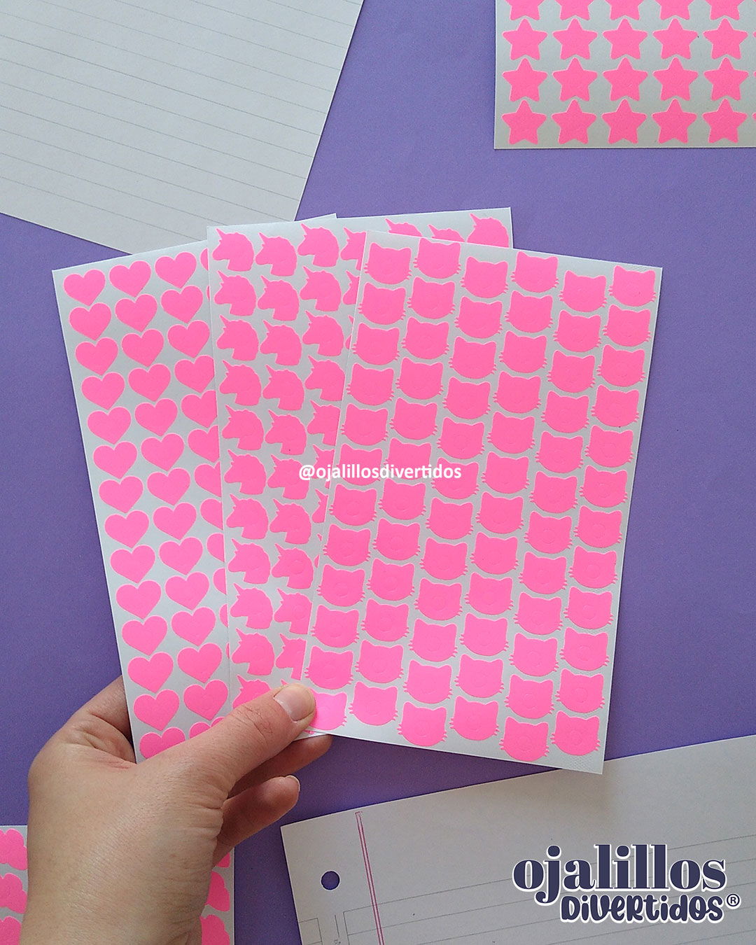 ¿Cuántos ojalillos trae cada planchita? / Amongus: 80 / Blonda: 84 / Capibara: 54 / Círculo clásico: 104 / Círculo grande: 66 / Corazón: 84 (ó 98 dependiendo el lote) / Corona: 63 / Estrella: 84 / Flor: 84 / Frutilla: 70 / / Gatito: 72 / Manzana: 76 / Mariposa: 72 / Osito: 72 / Pajarito: 78 / Sirena: 72 / Tiktok: 73 / Unicornio: 77